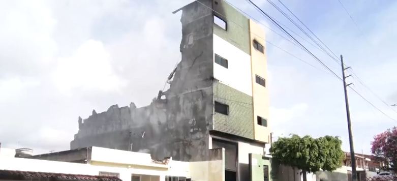 Os imóveis localizados próximos ao prédio que desabou parcialmente após incêndio foram interditados na Vila Kennedy, em Caruaru, no Agreste de Pernambuco. Segundo a Defesa Civil do município, ainda existe o risco iminente de que o edifício possa tombar totalmente.
