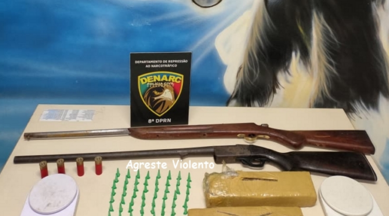 Diante da situação, os policiais entraram no imóvel e localizaram Micael Medeiros Ribeiro e Paulo Guilherme Vieira Pereira Silva. No interior da residência, foram apreendidos aproximadamente 1,8 quilo de m@c0nh@, 66 pinos de cocaína, além de duas espingardas calibre 12 e quatro munições do mesmo calibre, evidenciando a estrutura criminosa mantida pelo grupo.