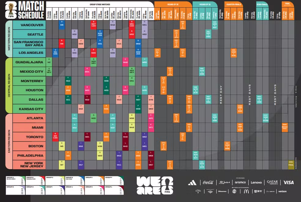Os jogos serão realizados em cidades do Leste dos Estados Unidos: as possibilidades são Atlanta, Boston, Miami, Nova York/Nova Jersey e Filadélfia. A tabela completa será divulgada neste sábado. As informações são do Globo Esporte.