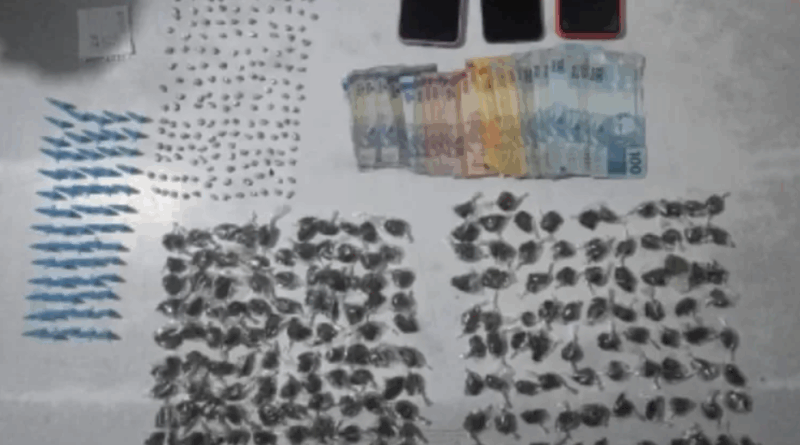 A mulher acabou se rendendo no interior do imóvel, enquanto o homem foi localizado em um terreno baldio próximo, escondido com mais drogas. Na ação, os policiais apreenderam 66 pinos de cocaína, 174 pedras de crack, 182 papelotes de maconha, R$ 1.204 em espécie, materiais para embalagem, três celulares e uma faca tipo punhal.