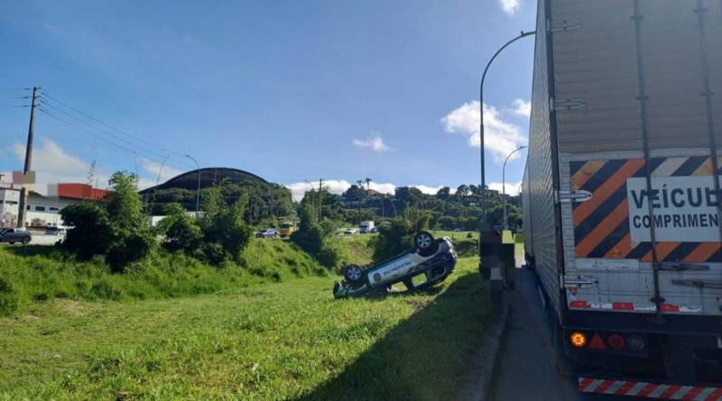 Uma viatura da Polícia Militar colidiu com um caminhão na manhã desta quarta-feira (22), na BR-101, no bairro da Guabiraba,
