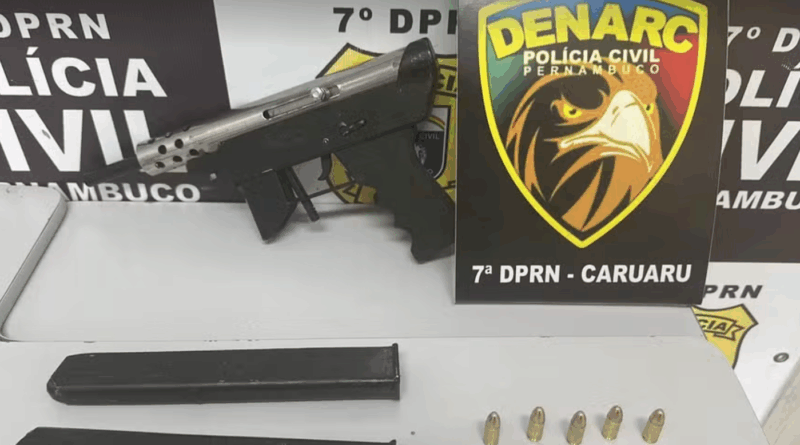Dois homens foram presos na tarde da quarta-feira (30) no Terminal Rodoviário de Caruaru, no Agreste de Pernambuco. A dupla, Matheus Amaro da Silva, de 21 anos, e Lazaro Fabrício da Silva, de 27 anos, estava portando uma submetralhadora com cartuchos e munições.