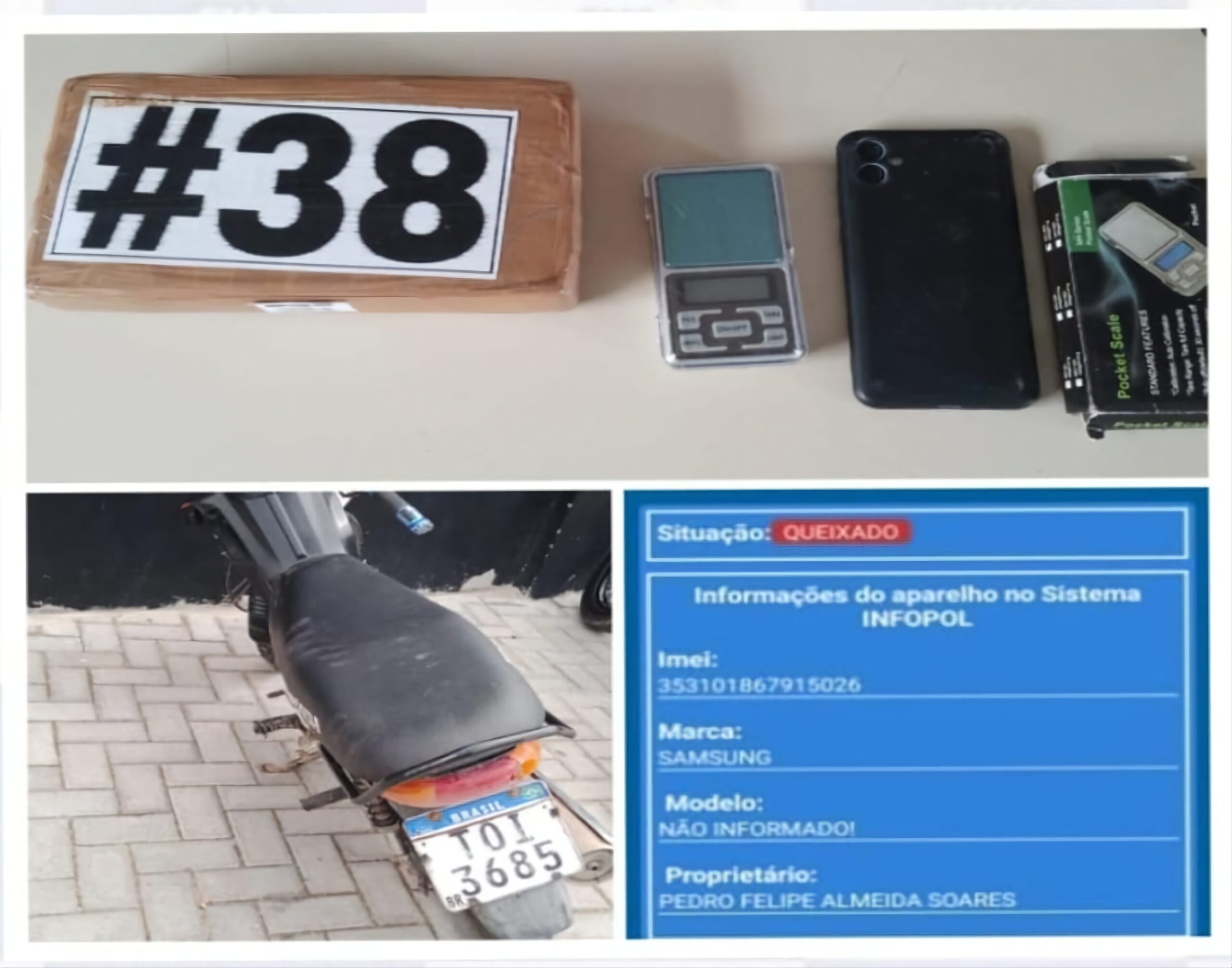Durante a abordagem, os policiais constataram que o celular do suspeito, um Samsung Allegro, possuía queixa de roubo registrada no sistema Alerta Celular. Além disso, foi encontrado em posse do indivíduo um tablete de aproximadamente 1,2 kg de cocaína, configurando crime de tráfico de drogas.