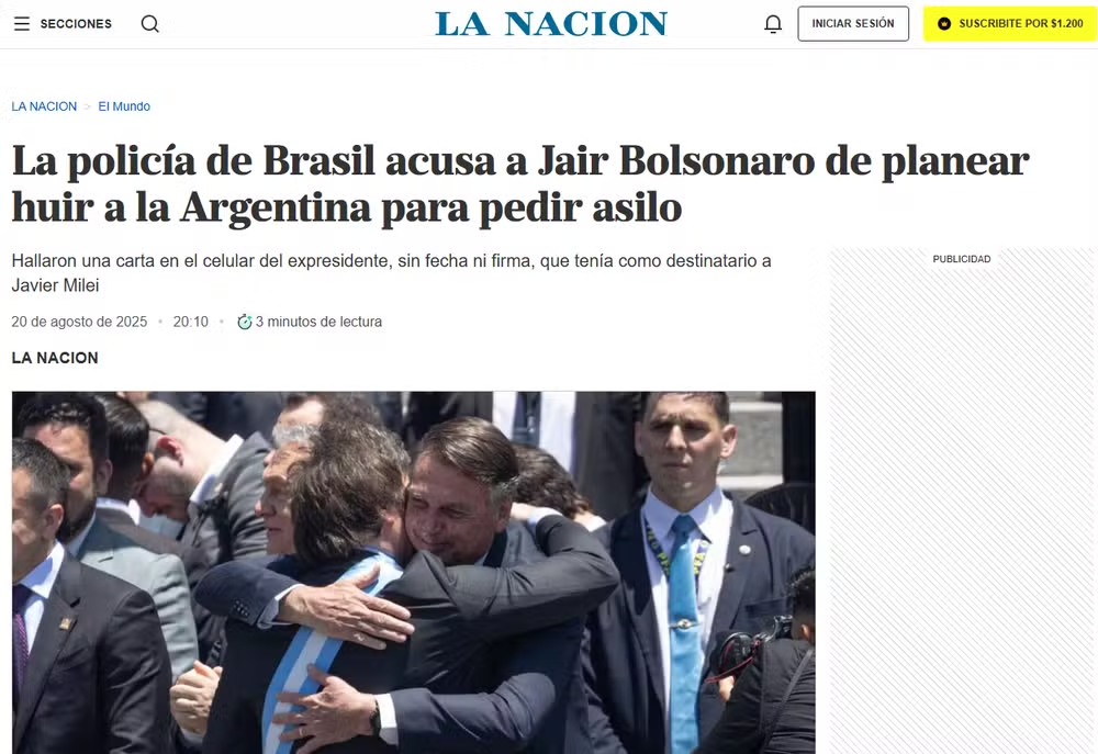 O jornal argentino Lá Nacion destaca que a polícia brasileira apreendeu um pedido de asilo político endereçado a Milei no celular do ex-presidente Bolsonaro. O veículo também aponta que o relatório da PF identificou um arquivo de texto modificado pela última vez em 12 de fevereiro de 2024, e afirmou que seu conteúdo revela que Bolsonaro “praticou atos para obter asilo político na Argentina”. As informações são do jornal O Globo.
