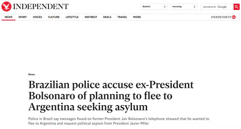 O britânico The Independent destacou que a polícia brasileira afirma que mensagens encontradas no telefone de Bolsonaro mostraram que ele queria fugir para a Argentina e pedir asilo político a Milei. O jornal também aponta que Silas Malafaia, pastor evangélico e aliado ferrenho de Bolsonaro, também foi alvo dos investigadores.