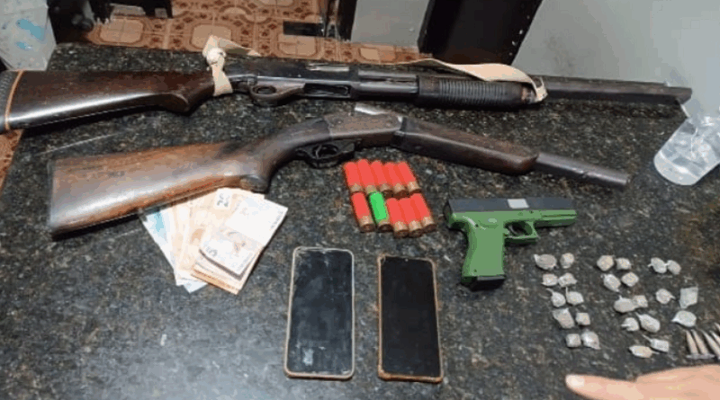 Dentro da casa, os militares encontraram outro homem, com quem foram localizados 25 bigs de m@c0nh@, cinco pinos de c0c@ín@ e R$ 750 em espécie. Ainda durante as buscas, foram apreendidas outra espingarda calibre 12, dez munições intactas e um simulacro de pistola.