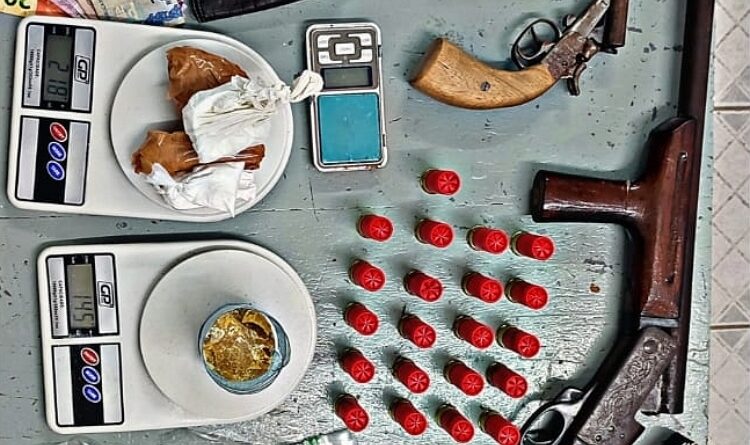 Questionado, o dono do estabelecimento confessou que possuía armas e entorpecentes, indicando onde estavam escondidos. Na residência e no bar, foram apreendidos: uma espingarda calibre 12, 21 munições calibre 12, uma garrucha calibre .44, oito munições calibre .44, 218 gramas de cocaína, 145 gramas de pasta base de cocaína, R$ 37 em espécie e três balanças de precisão.
