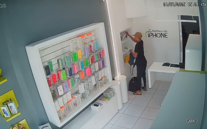 Câmeras de segurança registraram o momento do assalto. Dois suspeitos entraram na loja e colocaram os aparelhos em uma bolsa. Um deles seguiu para uma área interna do estabelecimento e rendeu os funcionários, enquanto o outro recolhia os celulares.