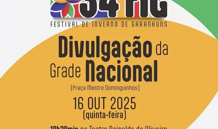 A Prefeitura de Garanhuns, por meio da Secretaria Municipal de Cultura, vai divulgar, nesta quinta-feira (16 de outubro), os artistas nacionais que farão parte da programação do Festival de Inverno de Garanhuns (FIG) 2026, especificamente das atrações da Praça Mestre Dominguinhos — palco principal do evento.