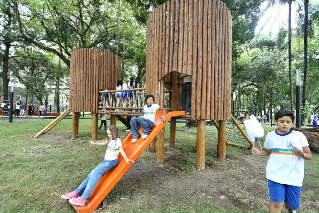 Com arborização e paisagismo, o ambiente tem equipamentos e brinquedos que estimulam o contato dos usuários com a natureza. “A gente tentou fazer o mínimo possível de intervenções construídas para poder garantir um ambiente natural no coração da cidade”, disse o prefeito do Recife, João Campos.